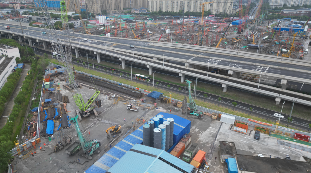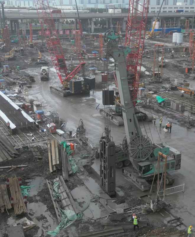 宝山高铁站地下连续墙工程面临多重施工挑战:首先,近期上海持续高温、台风、强降雨等恶劣天气情况,地表温度超70℃,对工程人员体能、设备稳定性构成极大考验;其次,工程需完成槽宽1.2m、槽深63m的超深地连墙施工,突破常规作业深度;第三,工期紧张,每幅槽作业时间严格控制在15-16小时,对设备性能与施工组织提出极高要求。